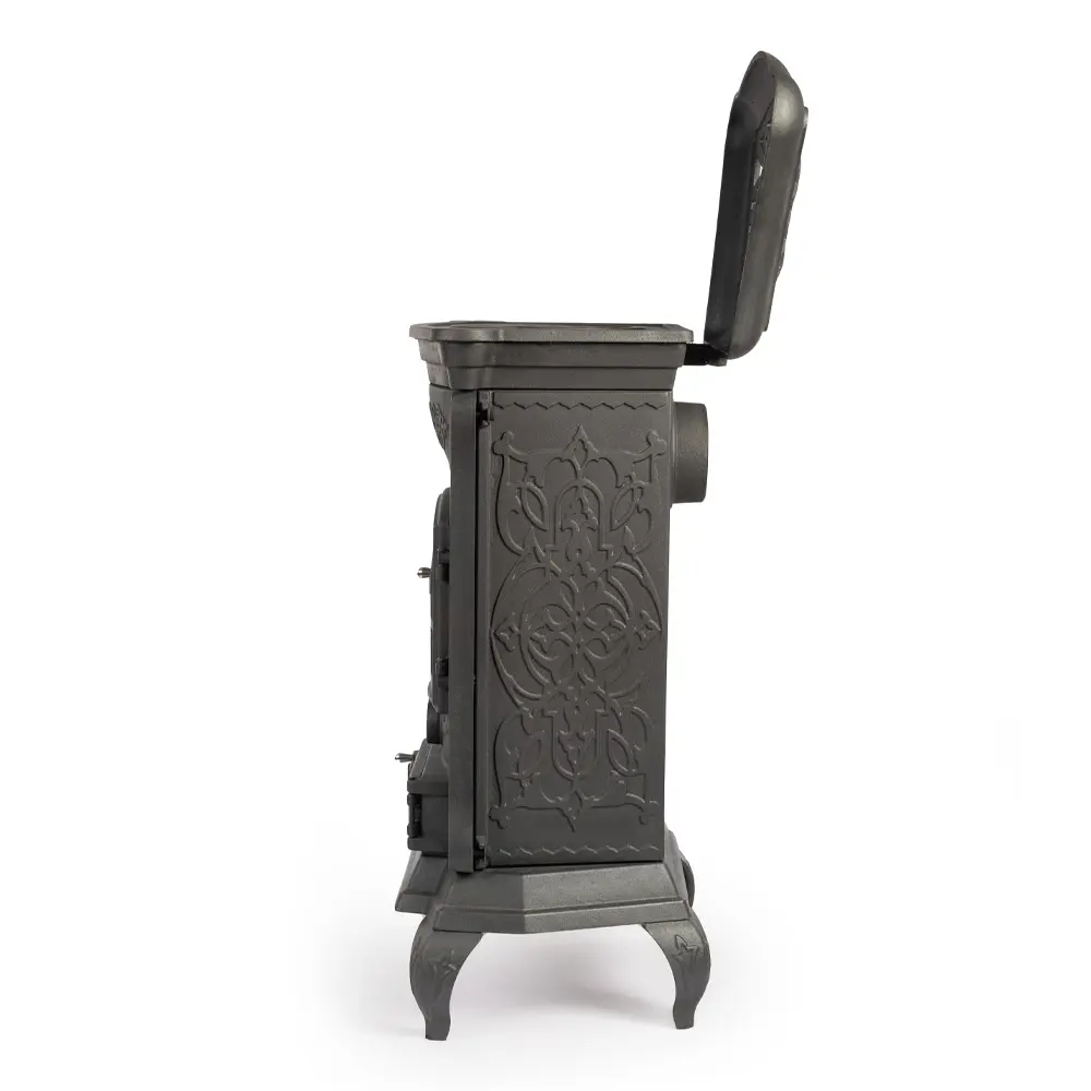 Изящная и компактная отопительная печь Step от российского бренда FireWay не оставит равнодушными любителей изящных решений в стиле шебби-шик, кантри и винтаж. Эта небольшая, полностью чугунная печка занимает минимум места, но неизменно привлекает внимание. Корпус печи покрыт выпуклым орнаментом, стекло дверцы оформлено решеткой, решетчатой сделана и верхняя крышка, которая в поднятом виде становится дополнительным элементом декора. Печка рассчитана на обогрев помещения объемом 110 куб. метров. Она отлично подойдет для использования в качестве дополнительного источника тепла.