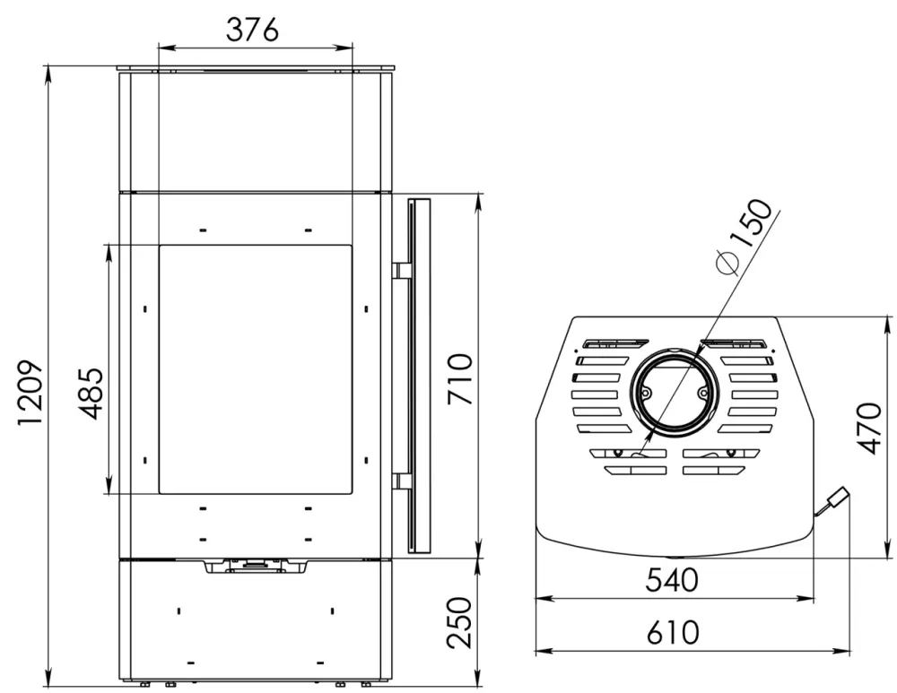 Большое прямое стекло открывает отличный вид на огонь. Футеровка топки выполнена из вермикулита. Очаг с возможностью подключения притока воздуха извне. Выдвижной нижний ящик оснащен системой "Push-to-open" с направляющими. Дымоход, диаметром 150 мм, подключается сверху или сзади.