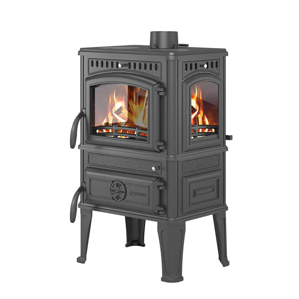 Печь-камин Везувий LV-12PS "Антрацит" изготовлена из качественного жаростойкого чугуна (ГОСТ 1412-85) с толщиной стенок 6-8 мм. Вес печи составляет 155 кг. Модель рассчитана на обогрев помещений объёмом до 240 м³. Особенность LV-12PS - в наличии варочной панели с конфорками в верхней части печи, БОКОВОЕ ОСТЕКЛЕНИЕ ТОПКИ.