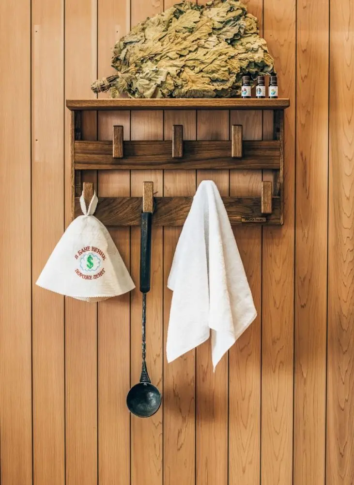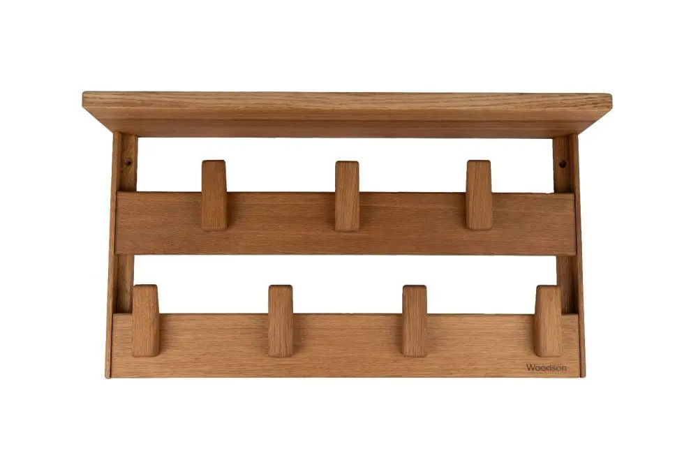 Вешалка Woodson Семирамида размером 34*60 выполена из массива кавказского дуба. Банный аксессуар совмещает в себе вешалку для одежды и полотенец, а так же полку для банных принадлежностей.
